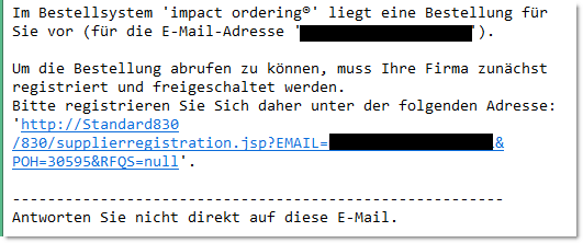 Damit ist das Anlegen eines CPD-Vertrages abgeschlossen. Fügen Benutzer, die für den CPD-Katalog berechtigt sind, im Warenkorb ein Produkt frei hinzu, können sie nun den CPD-Lieferanten auswählen (gleiches gilt für Preisanfragen zum Einholen eines Angebots, sofern erlaubt). Außerdem müssen je Position E-Mail-Adresse und Telefonnummer des/der gewünschten Lieferanten im Warenkorb hinterlegt werden. An diese Adressen werden nach einer eventuell notwendigen Genehmigung und der Bestellerzeugung die E-Mails mit der Aufforderung zum Registrieren versandt. Diese könnte wie folgt aussehen: