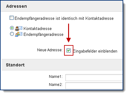 Wenn beide Adressen gleich sind, aktivieren Sie die Option Endempfängeradresse ist identisch mit Kontaktadresse. Sie müssen die Adresse dann nur einmal eingeben bzw. bearbeiten.